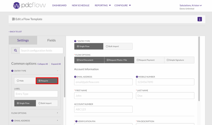 - Configure your Flow template to require an Entry Type selection. This will allow users to choose between Single Flow and Bulk Import when using the template.